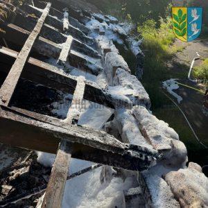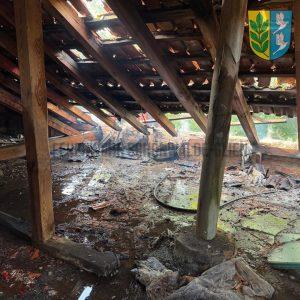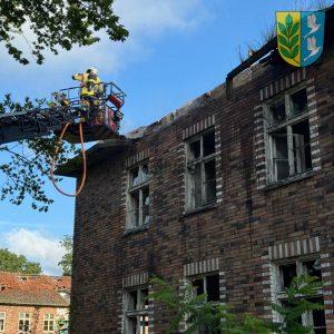 Vor Ort löschten die Kameradinnen und Kameraden die brennenden Dachbalken des leerstehenden Gebäudes. Mithilfe der Drehleiter konnte ein Teil der Dachhaut aufgenommen werden, um auch von außen gezielt Löscharbeiten vorzunehmen.