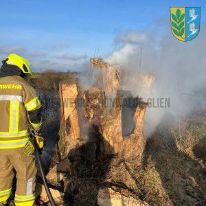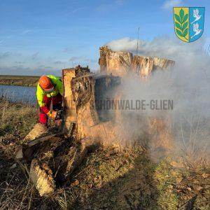 Wir öffneten den Baumstumpf mit Hilfe einer Motorkettensäge und löschten den innen schwelenden Brand mit Hilfe von Wasser und Schaum.